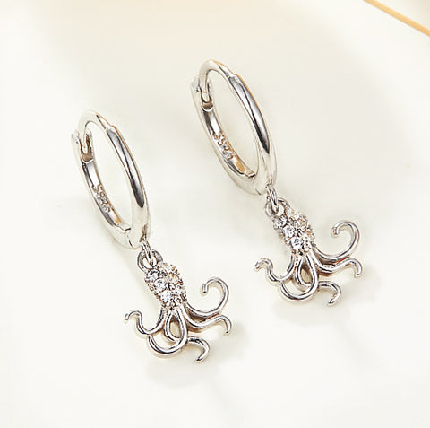 These playful Sterling Silver Huggie Earrings feature a tiny octopus charm adorned with sparkling rhinestones for a touch of ocean-inspired sparkle. The octopus dangles delicately from the sleek huggie hoops, adding movement and charm to your look. Crafted from high-quality sterling silver, they are both whimsical and elegant—perfect for sea lovers or unique jewelry collectors.