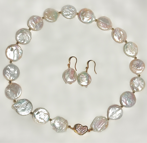 Adorn yourself with the timeless elegance of this stunning Coin-Shaped Keshi Pearl Necklace, delicately accented with gold-plated sterling silver ball beads. The necklace is finished with a charming heart-shaped clasp, beautifully embellished with sparkling cubic zirconia, adding a touch of brilliance to your look. The matching earrings, crafted with gold-plated sterling silver hooks also adorned with cubic zirconia, perfectly complement the necklace for a complete, radiant set. Known for their calming and balancing energy, Keshi Pearls are believed to promote inner peace, enhance emotional stability, and attract prosperity. Pearls are also said to strengthen relationships and bring a sense of harmony and love to the wearer. This exquisite jewelry set is perfect for special occasions or adding a graceful touch to your everyday style.
