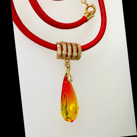 Elevate your style with this exquisite Swarovski fireopal pear drop crystal necklace. The dazzling crystal, suspended from a gold-plated sterling silver bail, exudes timeless elegance. The vibrant red leather cord chain adds a touch of bold sophistication, creating a striking contrast against the crystal's fiery hues. This meticulously crafted piece seamlessly blends opulence with contemporary design, making it a versatile accessory for any occasion. Embrace the allure of this necklace as it effortlessly captures attention and complements your individuality.