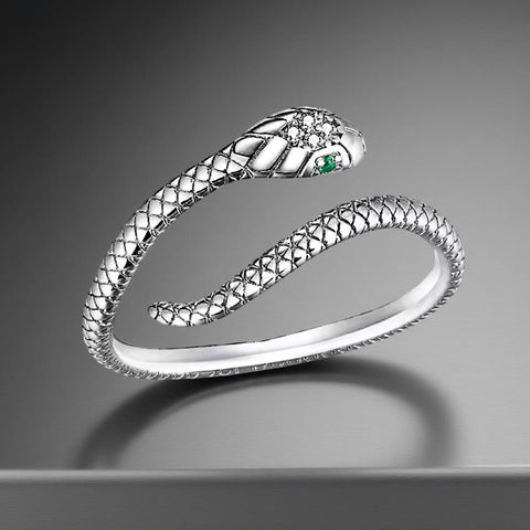 This elegant adjustable snake ring is crafted from sterling silver and showcases vivid emerald green crystal eyes for a striking effect. Available in gold, rose gold, and silver finishes, it wraps gracefully around the finger. A unique and stylish accessory, it’s perfect for adding a touch of edge and charm to any outfit.